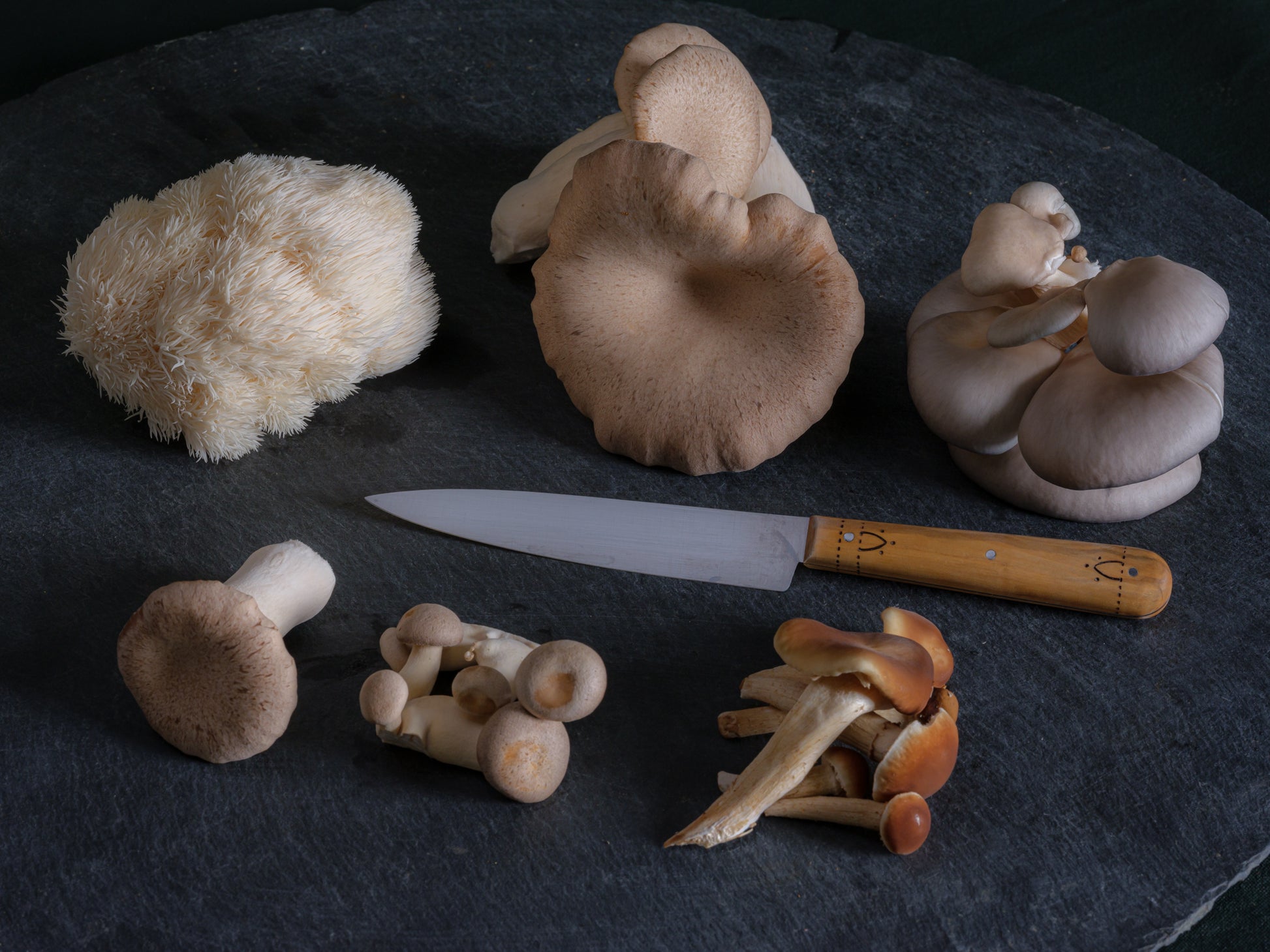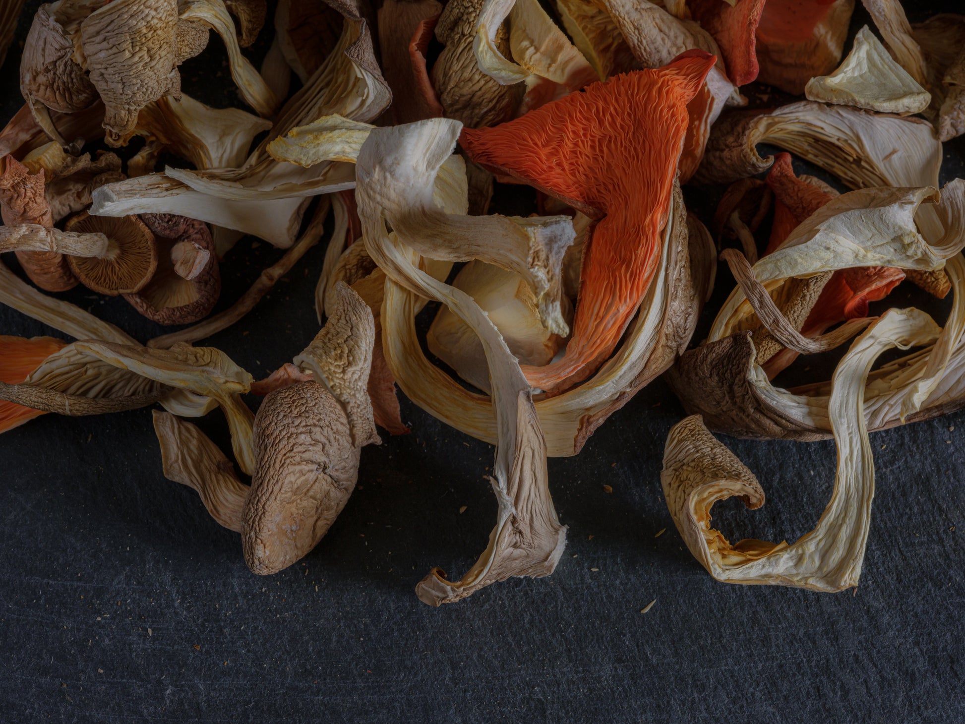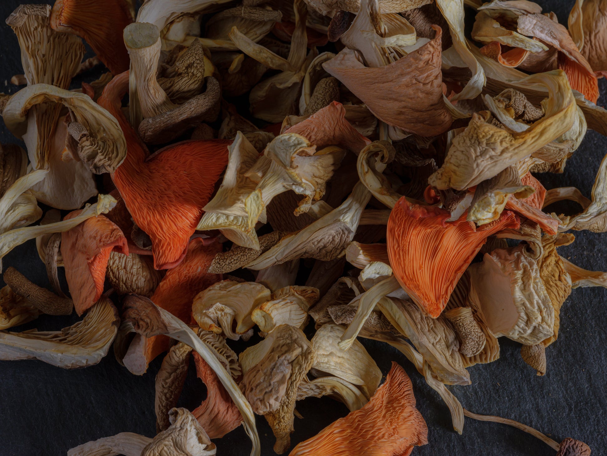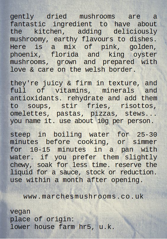 whole and sliced delicious oyster and woodland variety mushrooms, gently dried to preserve flavour and nutrients. a mixture of pink, grey, enoki, black pearl and king oysters.